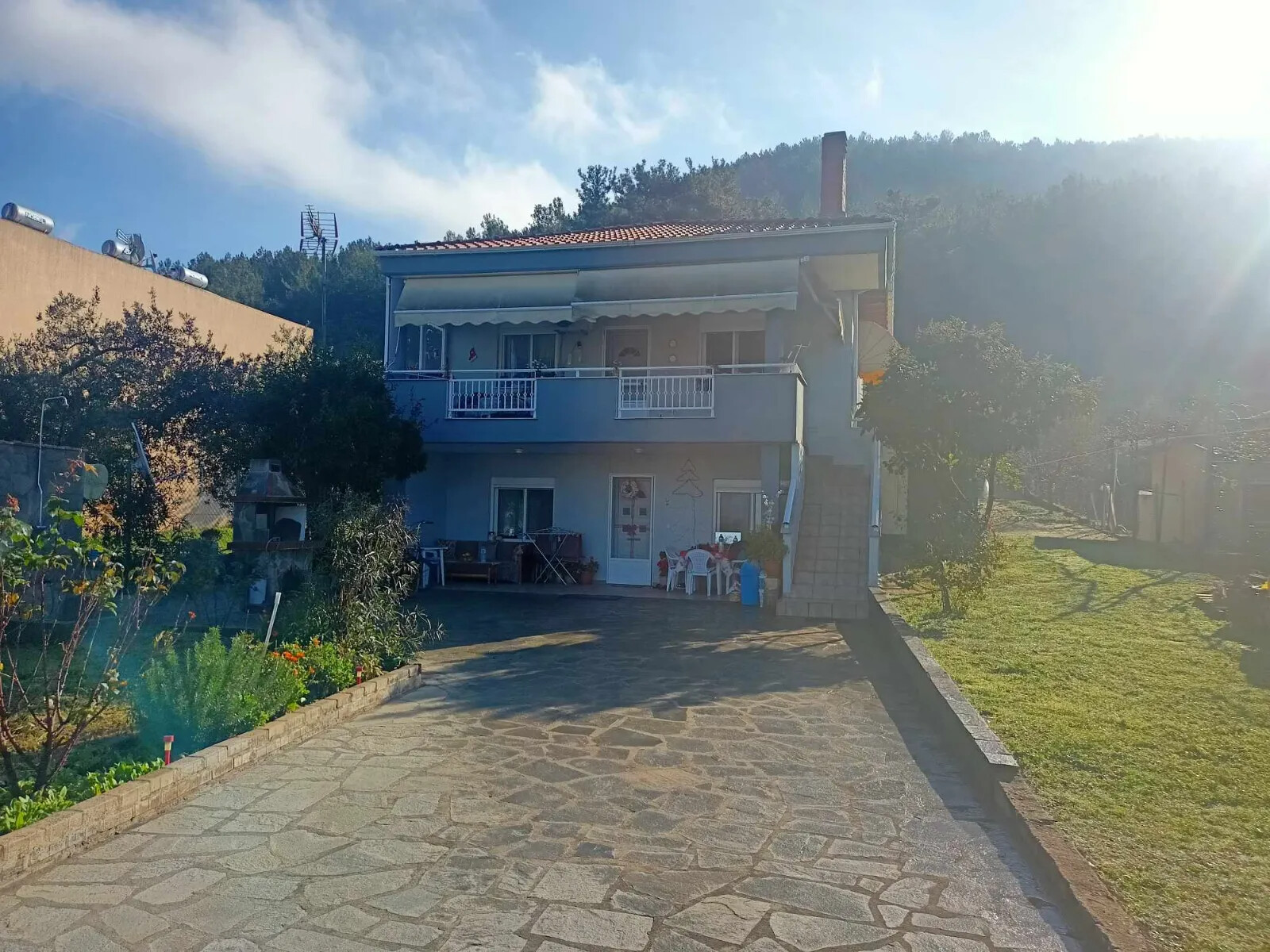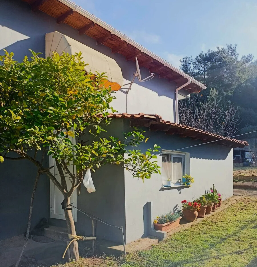Продается комплекс площадью 128 кв.м на острове Тасос. Комплекс имеет угловое расположение. Из окон открывается вид на море, на горы, на город, на лес. У объекта есть солнечные батареи для нагрева воды, камин, кондиционер, тенты, зона барбекю, отопление. Недвижимость продается с мебелью. К недвижимости относится парковочное место, сад.