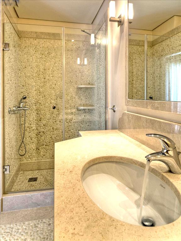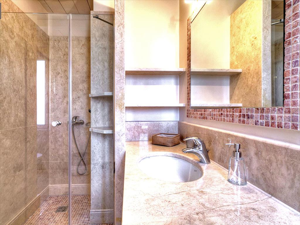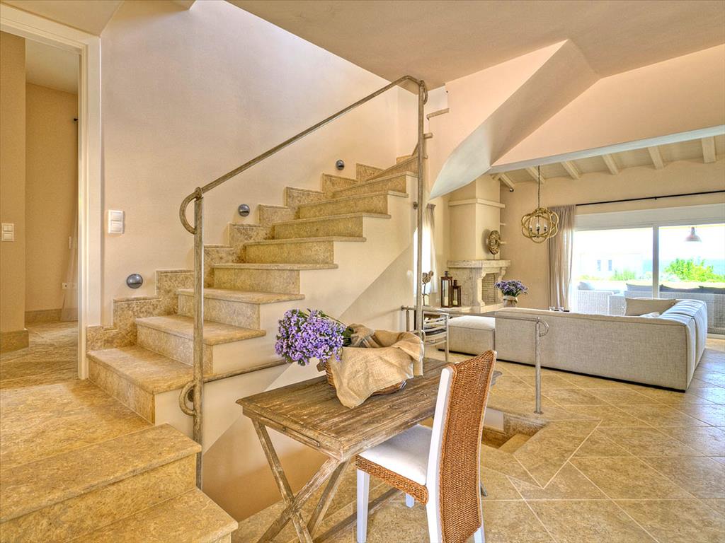 Вилла занимает участок площадью 2000 кв.м., с впечатляющим окружением, включающим бассейн, выложенную плиткой террасу, деревянные шезлонги и большие зонты, обеспечивающие тень. Дом, общей площадью 270 кв.м., сочетает в себе камень и дерево в своем внешнем дизайне, создавая гармоничное взаимодействие с природой. Внутреннее пространство отличается просторными комнатами с высококачественными материалами, такими как мрамор и дерево, и большими окнами, пропускающими много естественного света.