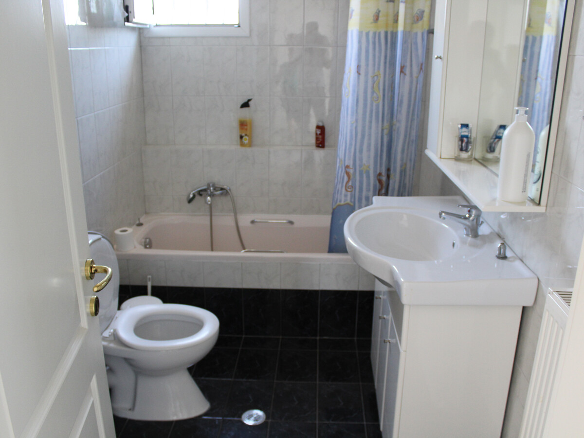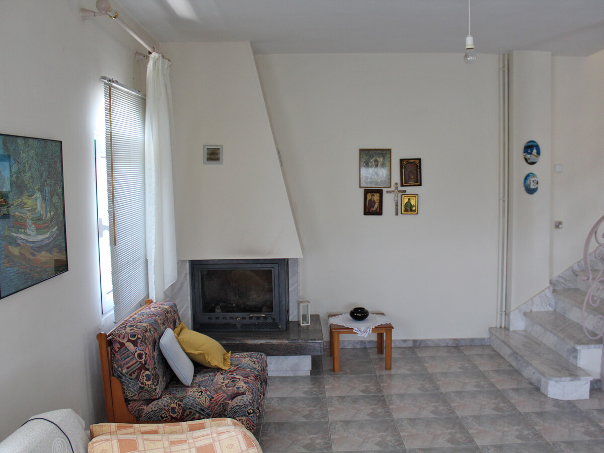 В доме есть гостиная с камином и кухня-столовая на 1 этаже, и одна ванная комната. Наверху расположены 4 спальни с выходом на балкон, терраса и вторая ванная комната. На цокольном этаже находится большое помещение, которое служило гаражом, кладовой и дополнительной кухней.