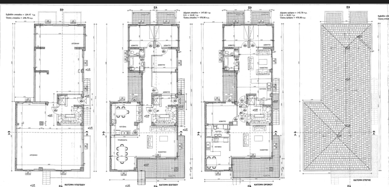 Продаётся частный дом в деревне Трилофо, Салоники, на трёх уровнях по 150 кв. м каждый: А. Этаж, разделённый на 2 квартиры по 75 кв. м каждая. Б. Первый этаж площадью 150 кв. м, который можно разделить на 2 квартиры. В. Подвал-первый этаж площадью 150 кв. м с вспомогательными помещениями - гаражом. Дом выполнен в исключительном качестве и находится в полузавершенном состоянии из бетона, так что его можно завершить по желанию. Участок составляет 406 кв. м. Открывается прекрасный вид на холмы и Термаикосский залив.