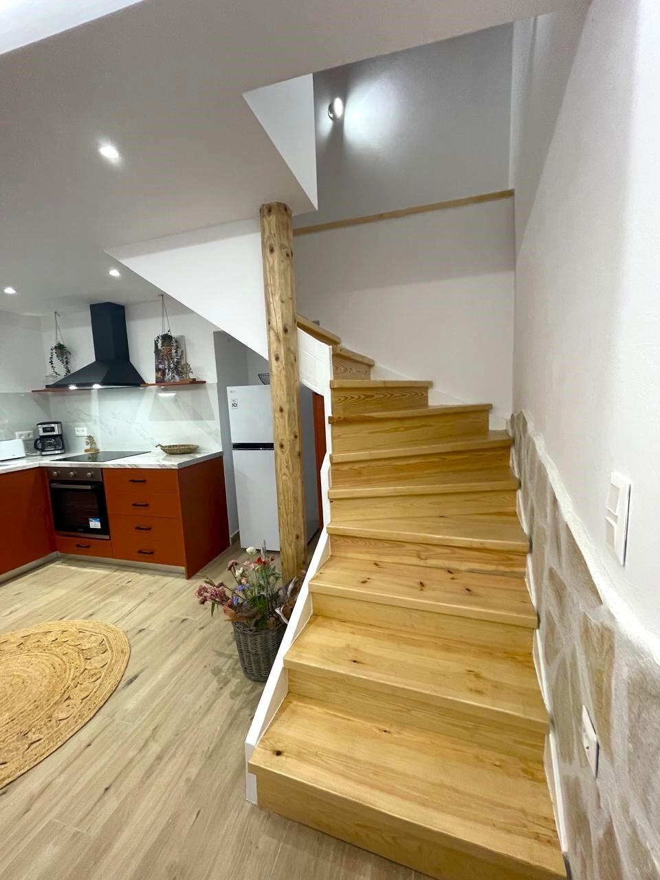 Мезонет полностью оборудован мебелью: диваном, стол, стулья, кровать, шкафы, кухня со всей бытовой техникой: стиральная машина, посудомоечная машина, холодильник, варочная панель, духовой шкаф и др. В ванной комнате на первом этаже установлен душ, на втором этаже установлена ванна. Внутренняя деревянная лестница соединяет два уровня дома.