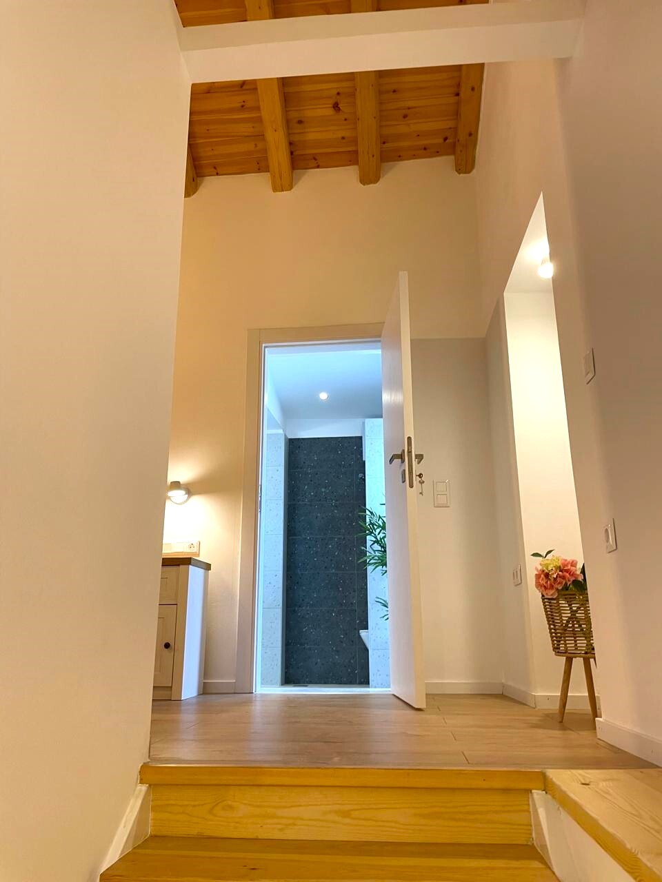 - прихожей, санузла, гостиной с кухней на первом этаже;